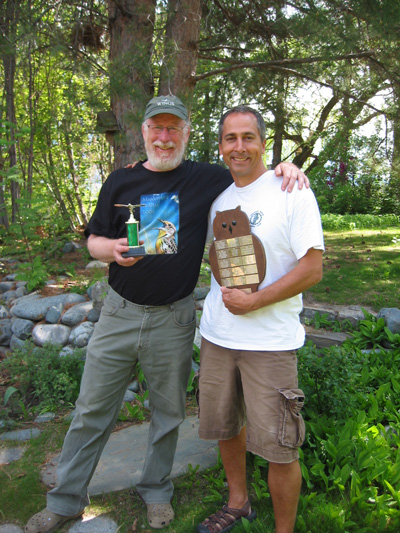 The cycle up the trail through the rugged Kearns Creek valley was spectacular in the late afternoon sun. The rolling hills and meadows, the balsamroot in full glorious bloom turning the grasslands yellow. Up and up we went, then barrelled down through the pines to the willows along the creek and out to the sagebrush of the White Lake basin. No new birds and a lot of new sweat, but in many ways it was the best part of the day. At White Lake the Brewer’s Sparrows were in full song (128!), so we did the loop around the lake and ditched our bikes for a hike through the sage. Maybe we could find a singing Grasshopper Sparrow or kick up a Gray Partridge. We did find a Wilson’s Phalarope working along the lakeshore (129) but nothing else new. Still feeling good, we got back to the bikes and the day started to unravel a bit. Martin’s front tire was flat. He put a new tube in, but found that the valve stem didn’t match his (or my) pump, so could only partially inflate the tire. We gave up plans for a side trip to find the American Kestrels that nest up the Twin Lakes Road and instead limped along to Three Gates Farm, arriving on schedule at 7:00 p.m. There we had a Northern Saw-whet Owl nest lined up (130!) and, just as important, a great hostess in Doreen Olson, who plied us with several glasses of cold water to rehydrate our sweaty bodies.
