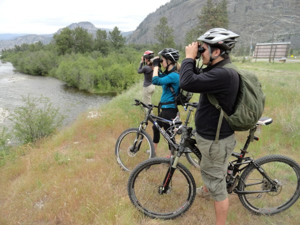 We continued down the road, checking off species after species in that exciting part of a Birdathon where every second bird is new. A Rock Wren sang at the gravel pit—something that would save us a half-hour of cycling at Vaseux Lake—and an American Kestrel watched from the power line. We’d missed kestrel entirely last year, so that was a huge relief. Back at the house, we did some quick rearranging of packs, watching all the while for Black-chinned Hummingbird at the feeders. The black-chin never showed, though, so when Eva appeared on her replacement bike we headed down the hill to Penticton, hoping that we could find that hummer later in the day. From the KVR trail we listened in vain for Yellow-breasted Chat—presumably the males at this site hadn’t arrived back from their winter haunts yet. A Ring-necked Pheasant called from the fields, and a Veery called from the woods below.