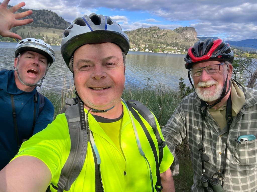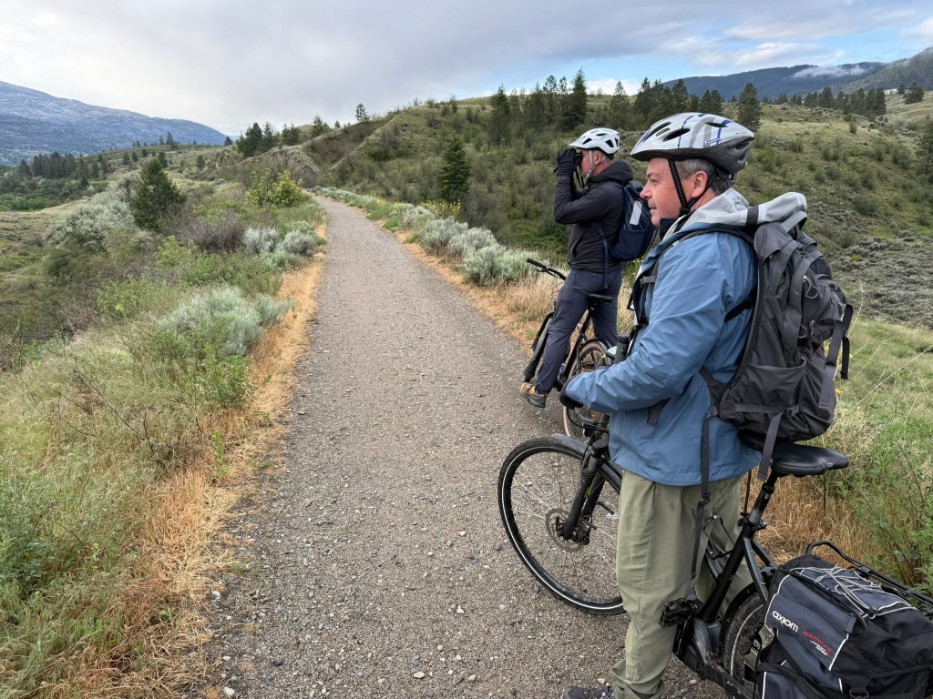 We plugged in the bikes to top up the batteries for the long day ahead, had a second breakfast, and repacked the bikes with everything we’d need. The weather was still cool, so we didn’t need to change clothing gear as we normally do. At 7:20 we were ready to go, coasting down the hill to the KVR trail on our way to the Okanagan River. A Ring-necked Pheasant called, quickly joined by a few others, a Sharp-shinned Hawk flew by (nice to get both common accipiters out of the way), and a Lazuli Bunting flushed off the trail and began to sing from a saskatoon. After several anxious moments, we finally heard a Yellow-breasted Chat singing from the rose thickets below—sometimes this is the only place on our route we hear them.