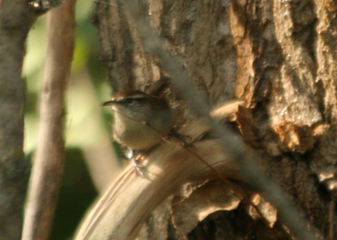 Bewick's Wren along Okanagan River in Penticton, BC, 8 October 2011. I just noticed as I heavily cropped this poor picture that the bird was banded! This is probably a bird dispersing from the Oliver area to the south.
