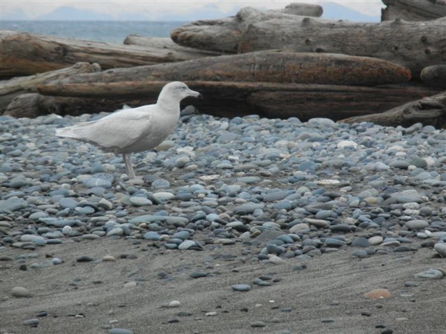 Ancient Murrelets landed close by and Short-tailed Shearwaters soared beside us. A tiny Song Sparrow came out from among the logs and a few Red-necked Grebes dove close by. But we had to leave, it was just too exposed. We went south down East Beach. It has changed a lot since we were last there. There are larger ponds, shifting sandbars and buried logs. Along the inside path where we often found sparrows, a dense spruce plantation has sprung up. We found chickadees, kinglets and a few song sparrows, but nothing new. On the way home the gull numbers along Tow Hill beach were incredible. Mew, Glaucous-winged, Western, Thayer’s, Herring and California fed along the waterline for miles. Eagles dropped in from time to time and a Peregrine Falcon swept low over the fringe of trees bordering the beach. Over 500 tiny white Sanderlings ran among the gulls and three very rare Glaucous Gulls were mixed in with the lot. There were more, but we got so wet we were beginning to get hypothermic. It was time to go home; to the wood stove, hot tea and cookies. Enough with the birds! ”