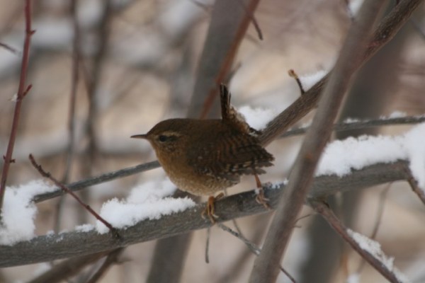 At another corner the road crosses a brush-filled creek gulley. We once had a dipper here (a most unlikely place!) but our real target was Pacific Wren. These tiny birds descend from subalpine forests to winter in thickets in the valley, but can be very skulky and hard to see in winter. I pished a few times and a wren quickly popped up and began to call. On a whim, Thor played the wren’s song on his iPod and the bird shot towards us, singing full tilt and swaying from side to side with its wings open. Another bird, presumably its mate, appeared as well and silently observed the show from a few feet away. We quickly stopped the playback, not wanting to disturb the bird further, but it was a surprising display of winter territoriality.